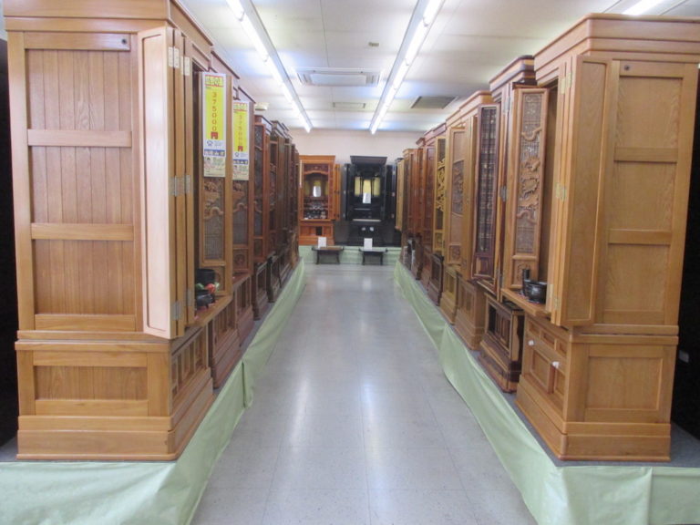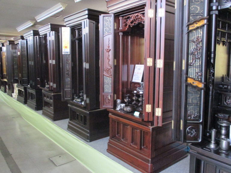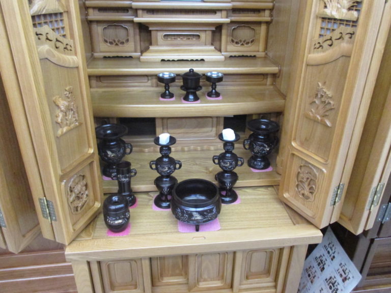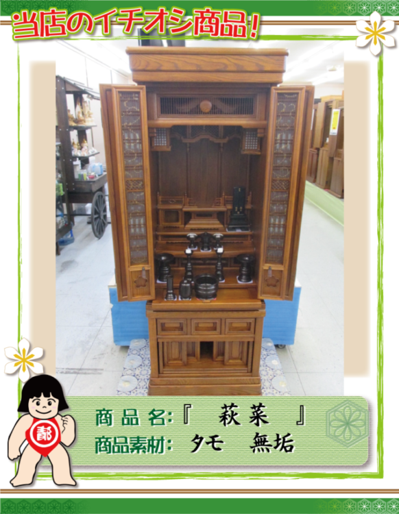 タモ材を贅沢に使用した、伝統的なお仏壇。 タモ材特有の明るめの色合いも人気の秘密です。 欄間や障子戸の格子組子もシンプルで飽きのこないデザイン。 サイズは18号、21号を展示しております。 お客様のご自宅に合わせたサイズ選びをご提案致します。